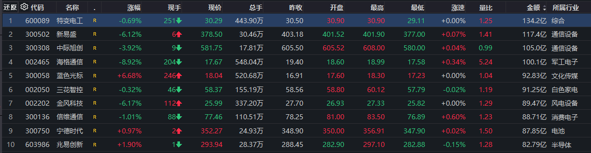 个股方面,特变电工早盘成交额134.2亿元居首,新易盛、中际旭创、海格通信成交额突破100亿元。