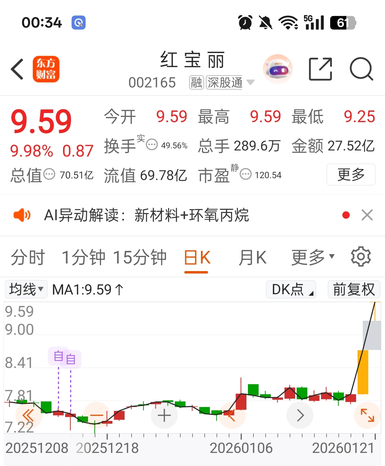 $红 宝 丽(SZ002165)$ 看票看太多,自选后,见待涨,就没有重点关注,一个月后踏空