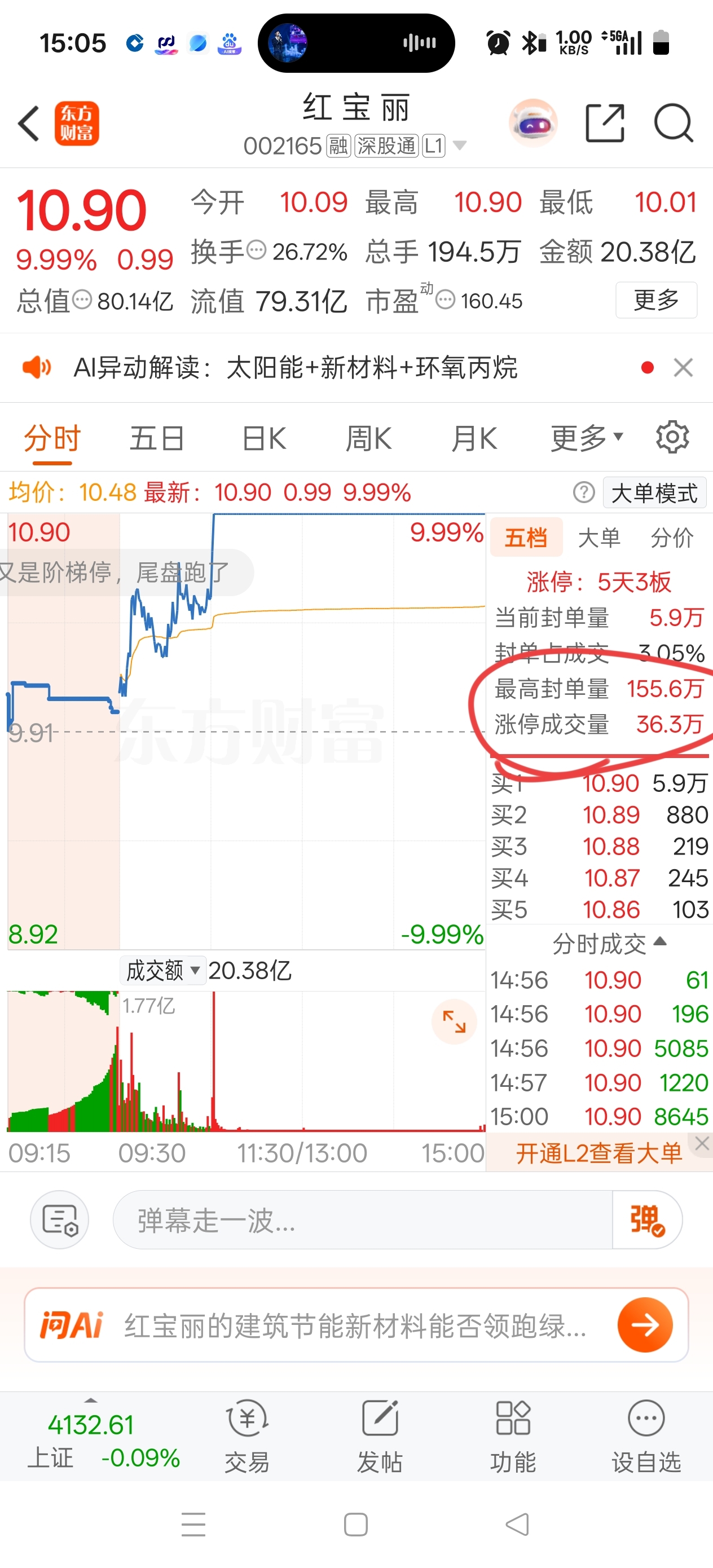 $红 宝 丽(SZ002165)$ 板上成交量36W手,最大封单量150w手,买不上的撤掉好多~主力买进近40w手。