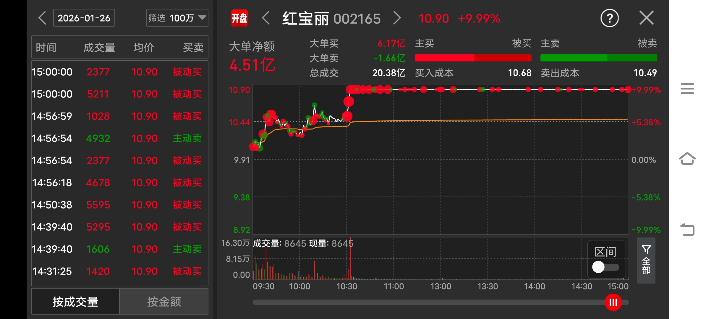 $红 宝 丽(SZ002165)$ 涨停封单量3.6多亿,收盘4.51亿,明天有望一字