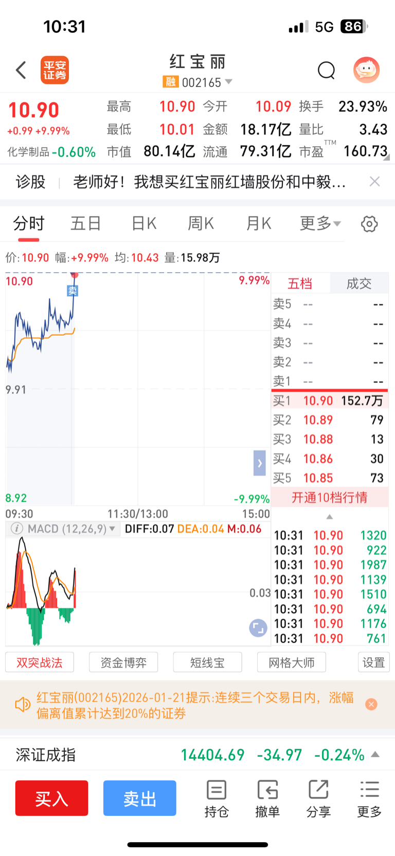 感谢红宝丽!今天正式清仓了!满仓抓获了三个涨停板!已经非常知足了