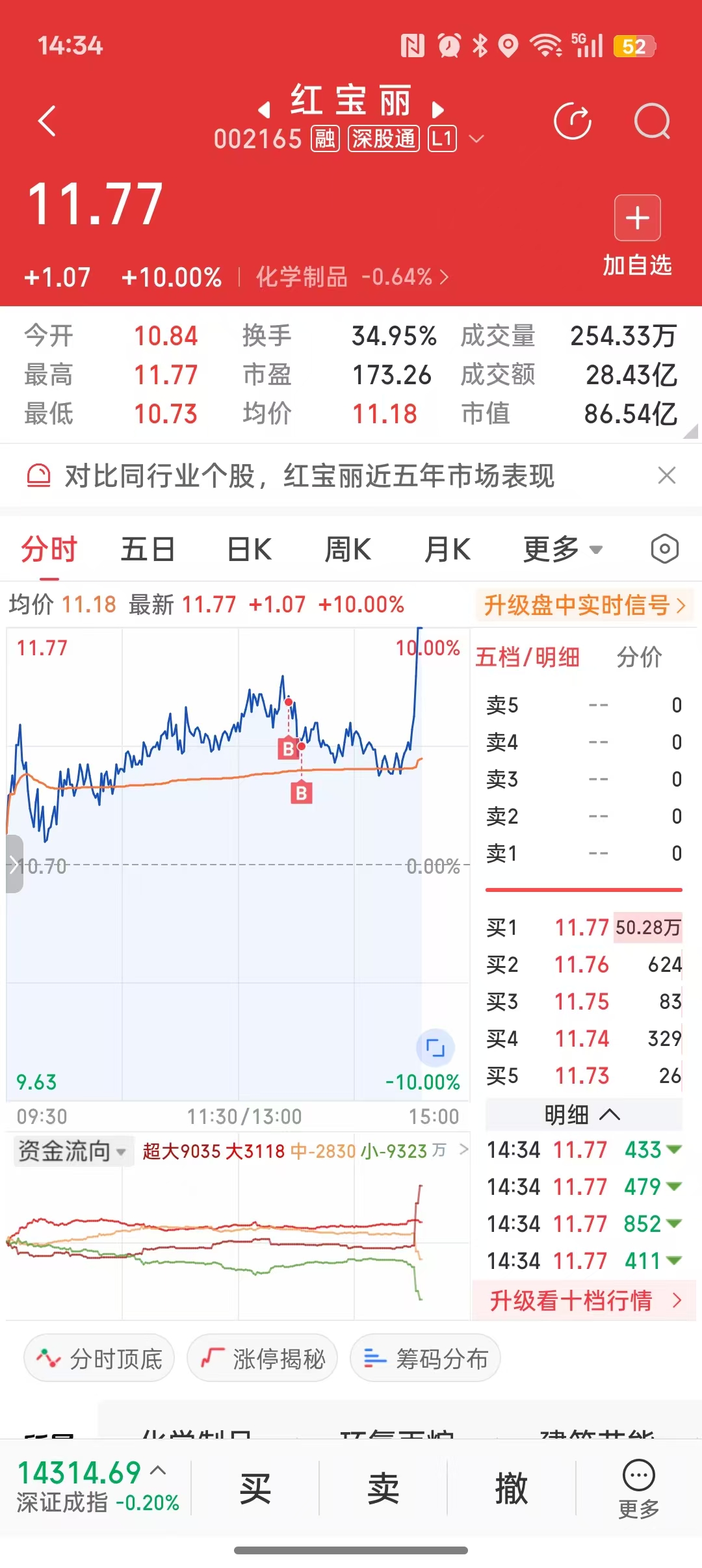拿了此股3天,每天都在加仓,机构左右倒右手,天天新高就是不拉板,今天果然没让人失望,跟洲际油气开始一个尿性。洲际把我洗出来了,加仓红宝丽果然啊。