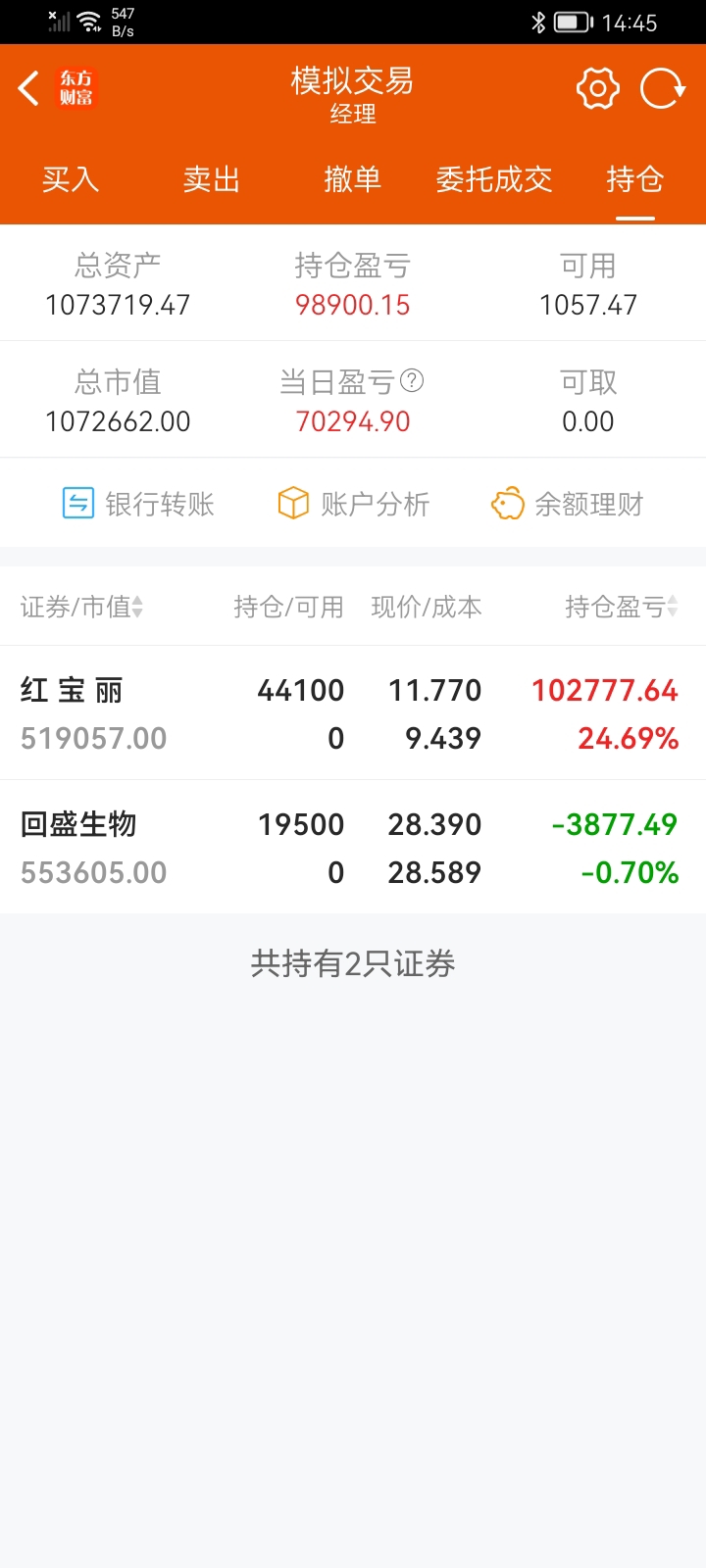 明天高开吧,今天入了回盛生物,价格低呢,红宝丽昨天买了今天午盘出了,红宝丽今天早