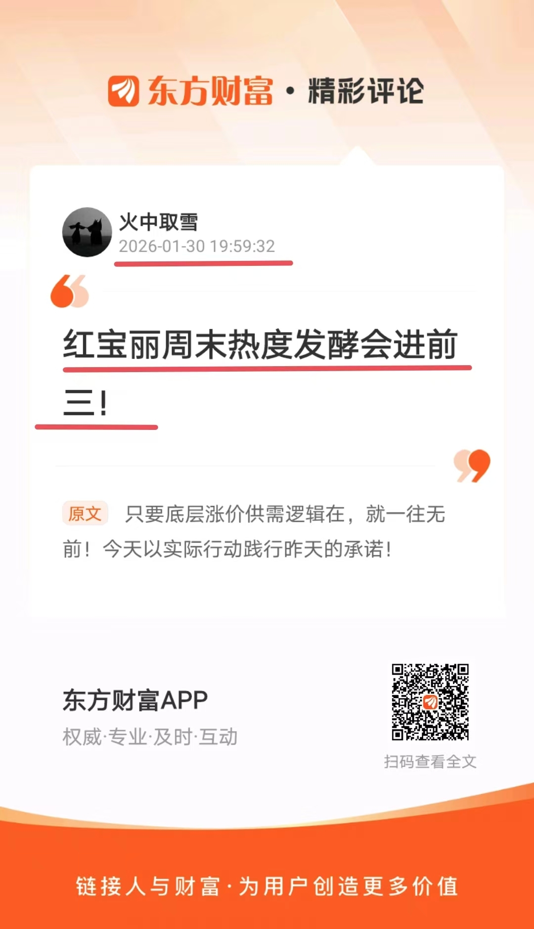 温馨提示: 1.根据《证券法》规定,禁止编造、传播虚假信息或者误导性信息,扰乱证券市场;2.用户在本社区发表的所有资料、言论等仅代表个人观点,与本网站立场无关,不对您构成任何投资建议。用户应基于自己的独立判断,自行决定证券投资并承担相应风险。《东方财富社区管理规定》