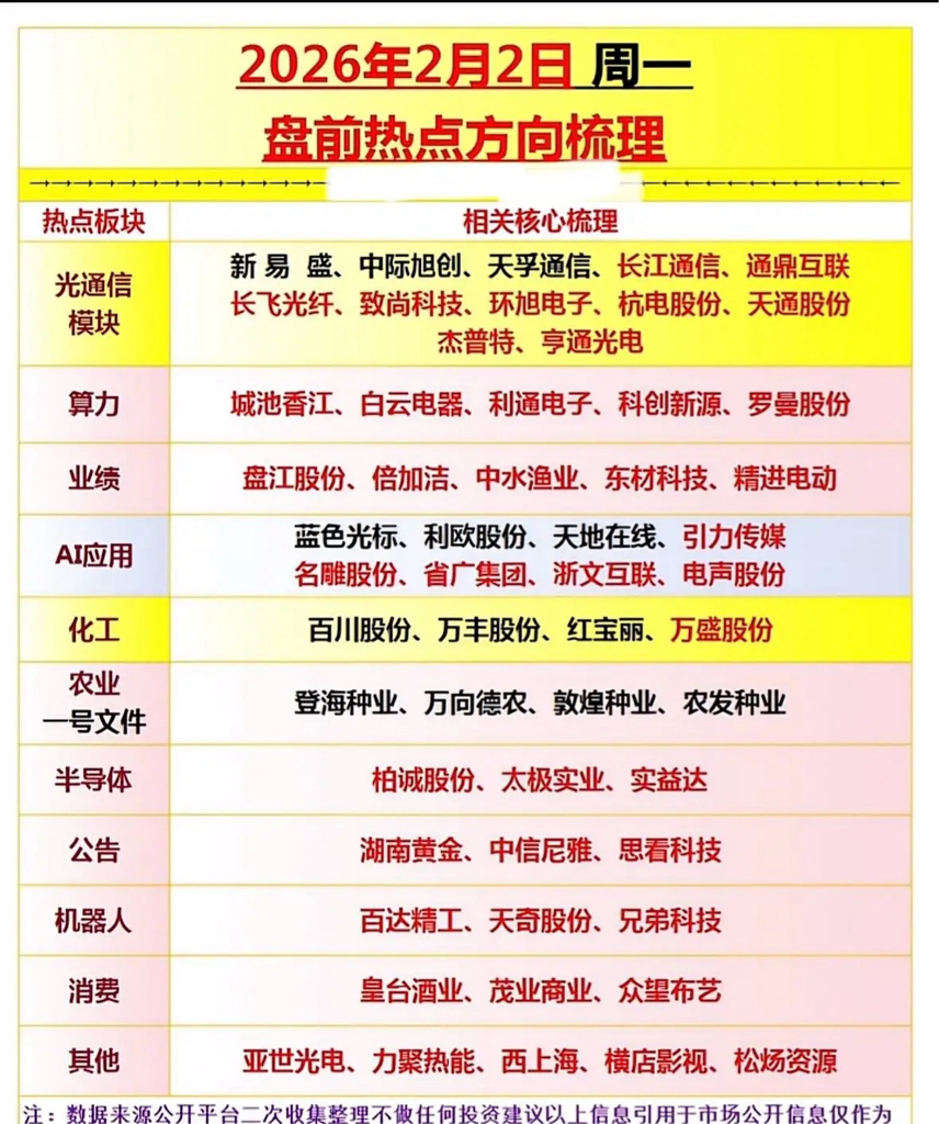2月2日星期一盘前热点方向梳理光通信与算力板块活跃,AI应用、农业、半导体轮动,