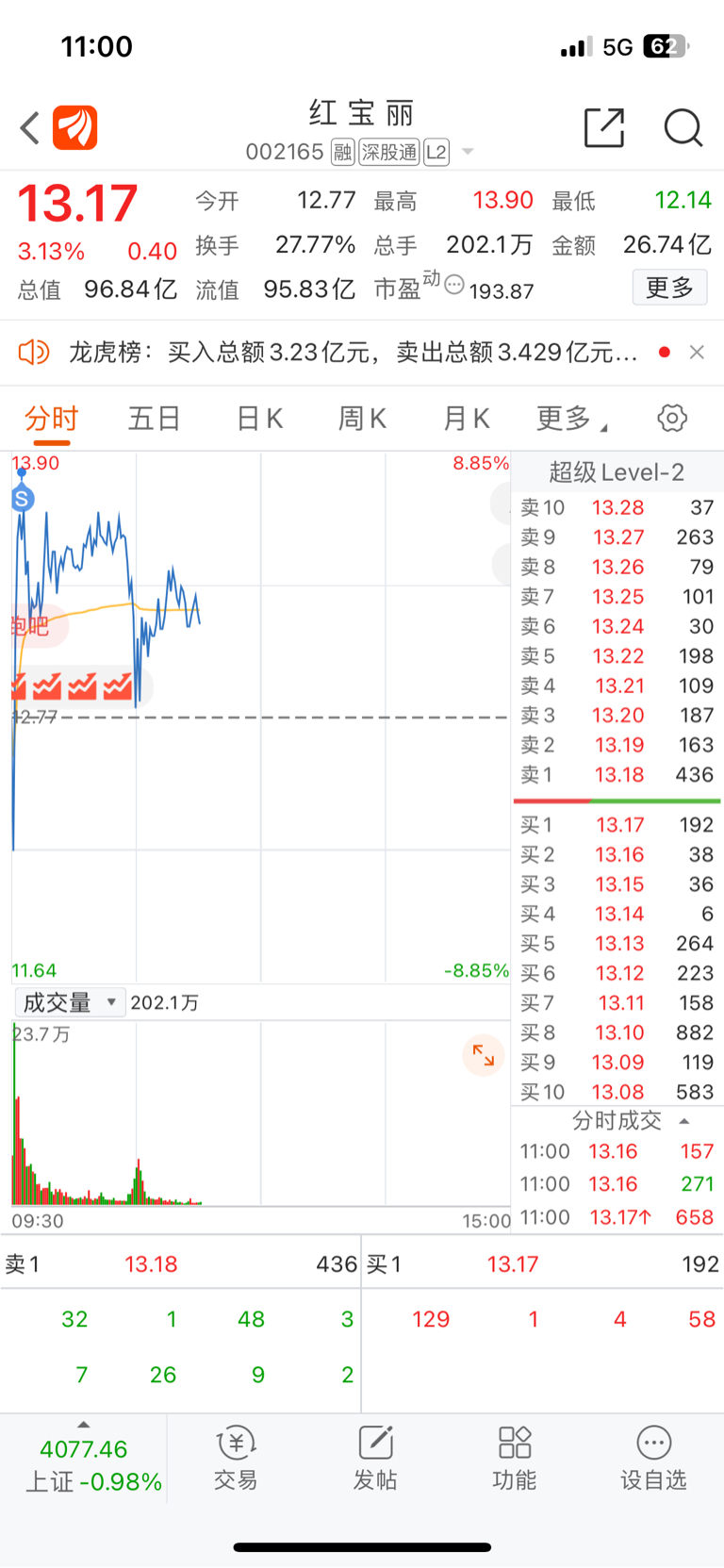 $红 宝 丽(SZ002165)$ 先走一步 明天来低吸