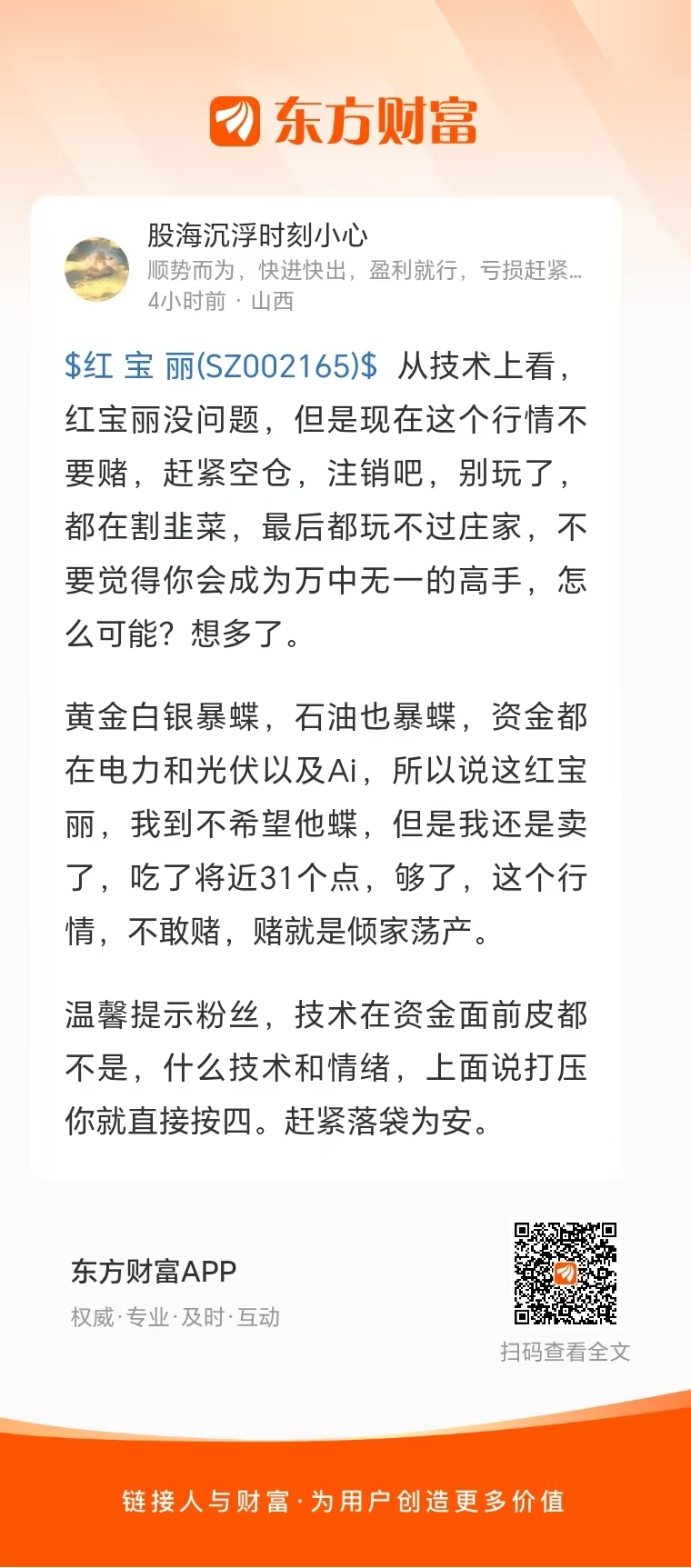 温馨提示: 1.根据《证券法》规定,禁止编造、传播虚假信息或者误导性信息,扰乱证券市场;2.用户在本社区发表的所有资料、言论等仅代表个人观点,与本网站立场无关,不对您构成任何投资建议。用户应基于自己的独立判断,自行决定证券投资并承担相应风险。《东方财富社区管理规定》