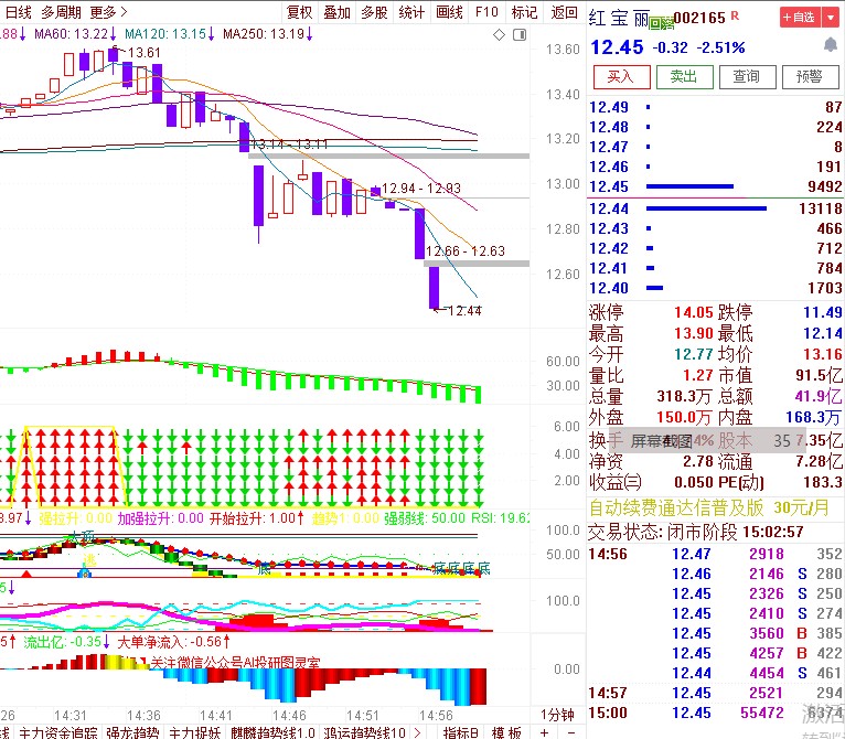 红宝丽一波持续上涨告一段落!红宝丽今天由上涨近+7%红盘到尾市收盘-2.51%,