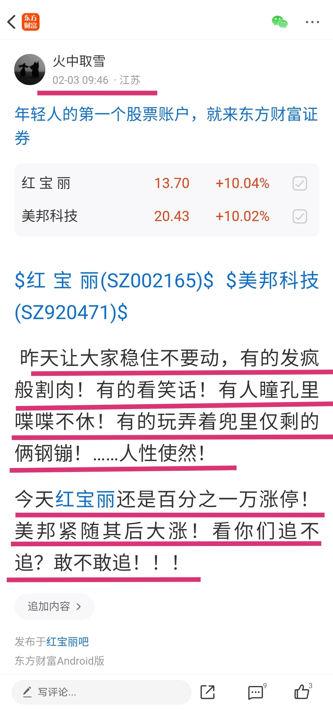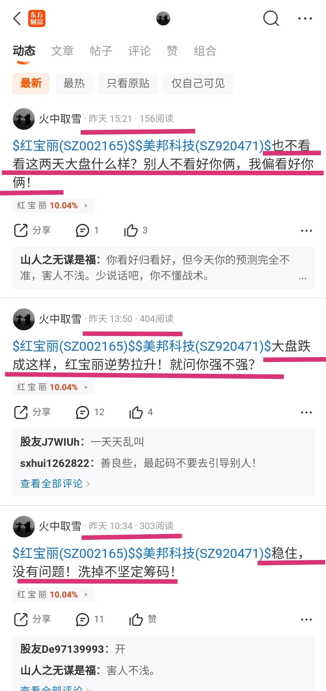 红宝丽涨停!美邦大涨!每个帖子都有时间佐证!一个人可以看多,但是在昨天,前天,大