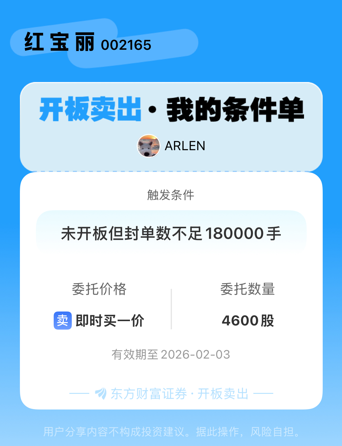 #条件单交流# #开板卖出晒单# 一位股神设置了一个开板卖出条件单,接下来就是见证奇迹的时刻~$红 宝 丽(SZ002165)$