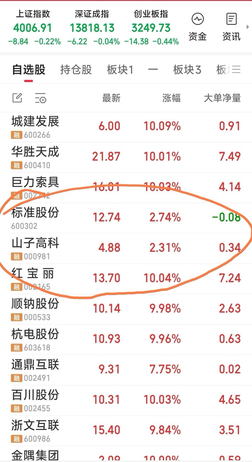 现手中三牛为:原有的标准股份,山子高科。,盘中接回老朋友红宝丽。标准股份,山子高科等高飞。
