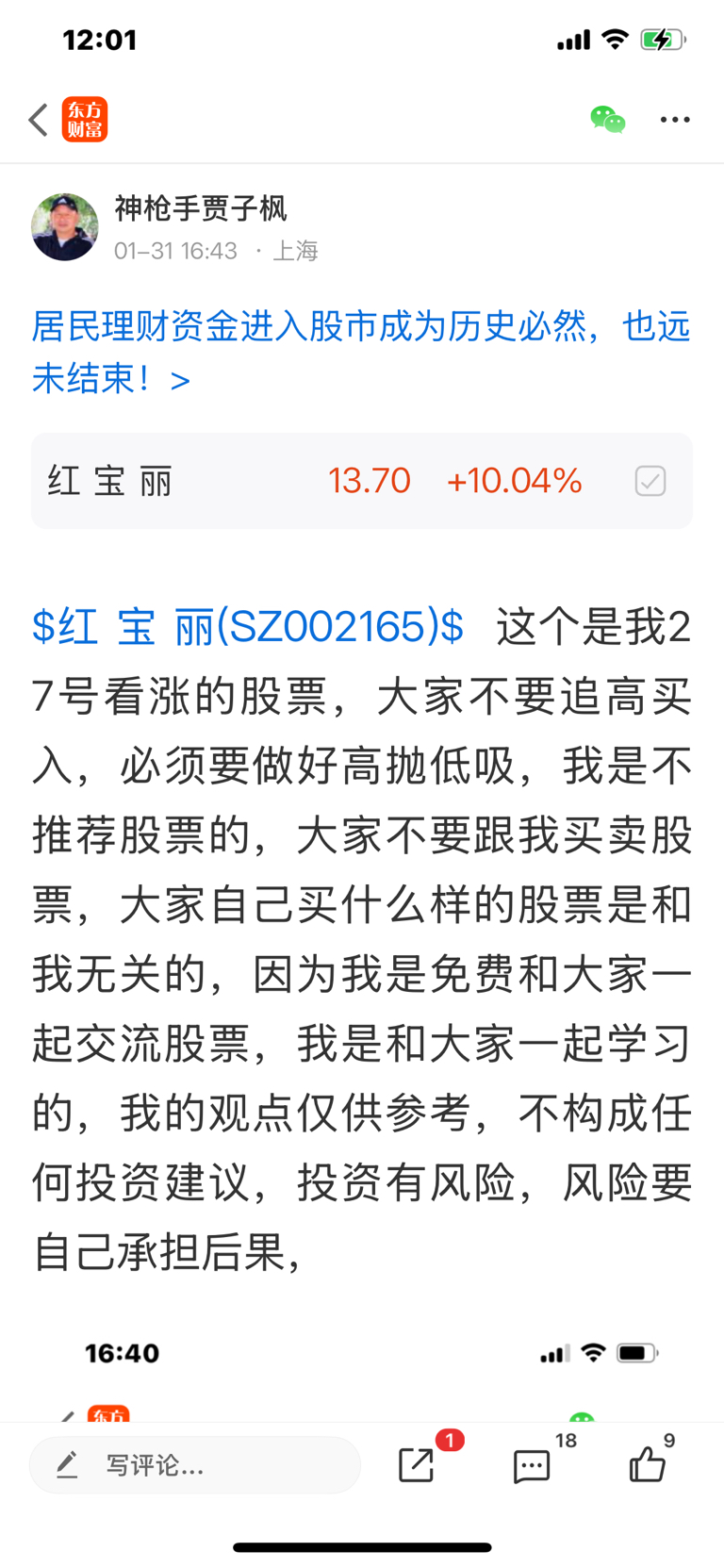$红 宝 丽(SZ002165)$ 这个是我一月二十七号发表看涨的股票,大家不要追高买入,必须要做好高抛低吸,我是不推荐股票的,大家不要跟我买卖股票,大家自己买什么样的股票是和我无关的,因为我是免费和大家一起交流股票,我是和大家一起学习的,我的观点仅供参考,投资有风险,风险要自己承担后果,