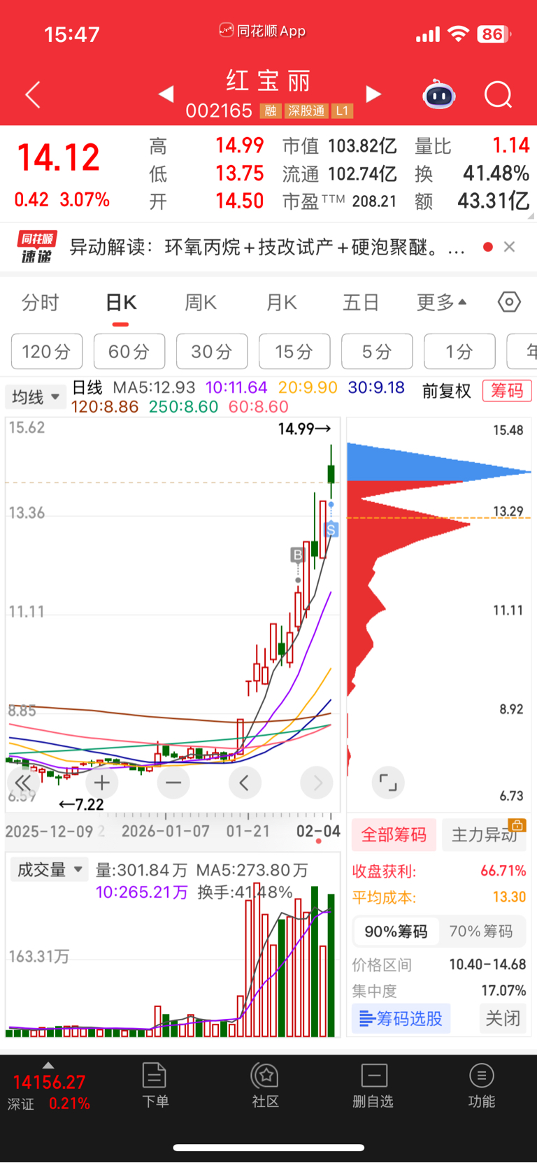 $红 宝 丽(SZ002165)$ 第一次玩这种高位放量的,吃了二十多个点跑了,感谢主力!发个帖纪念下