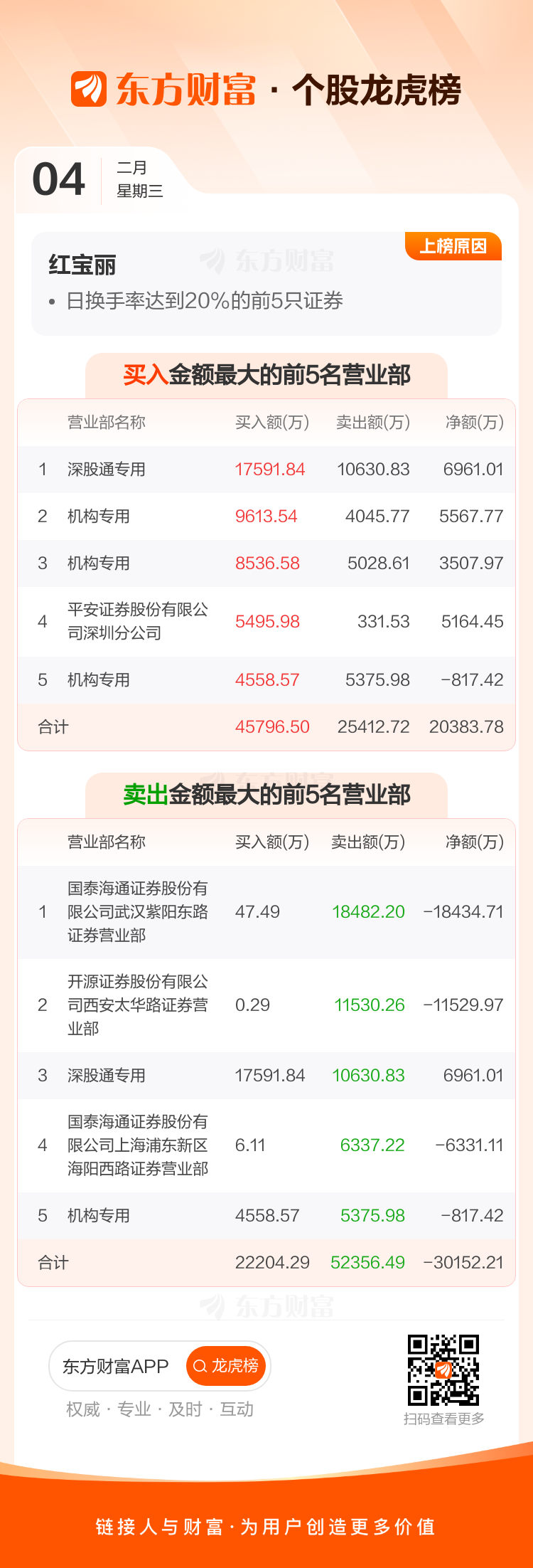 交易所2026年2月4日公布的交易公开信息显示,红宝丽因成为日换手率达到20%的前5只证券上榜。红宝丽当日收报14.12元,涨跌幅3.07%,偏离值41.49%,换手率41.48%,成交额43.31亿。