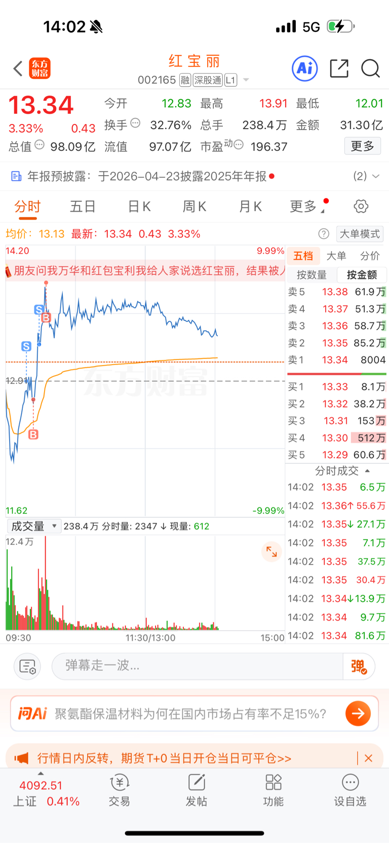 $红 宝 丽(SZ002165)$ 哭死,早上把卖,点成买