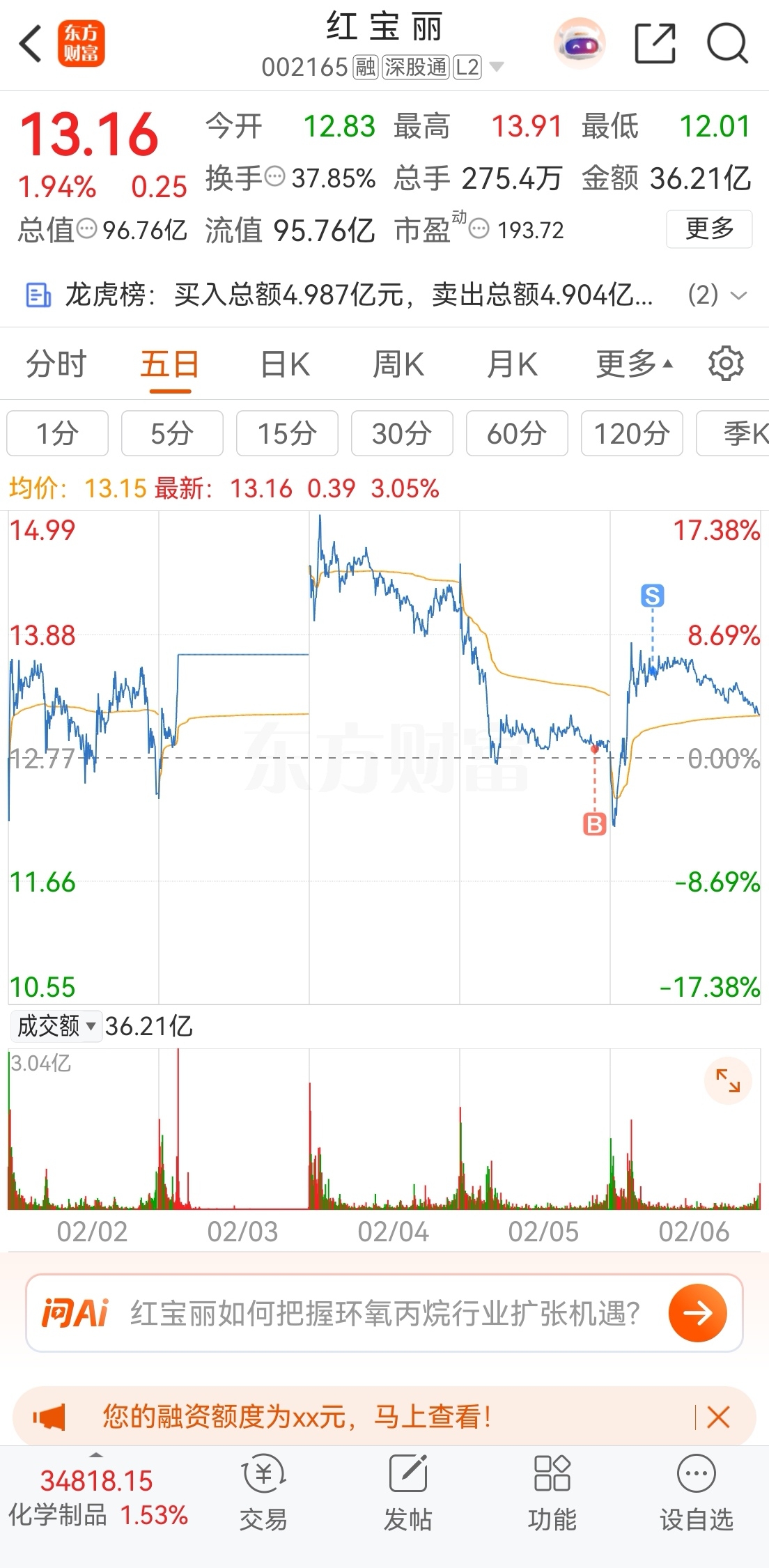 $红 宝 丽(SZ002165)$ 短线近五个点落袋