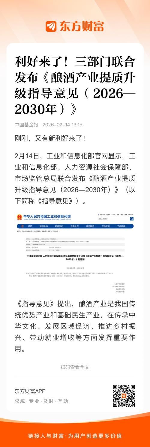 2月14日,工业和信息化部官网显示,工业和信息化部、人力资源社会保障部、市场监管总局联合发布《酿酒产业提质升级指导意见(2026—2030年)》(以下简称《指导意见》)。