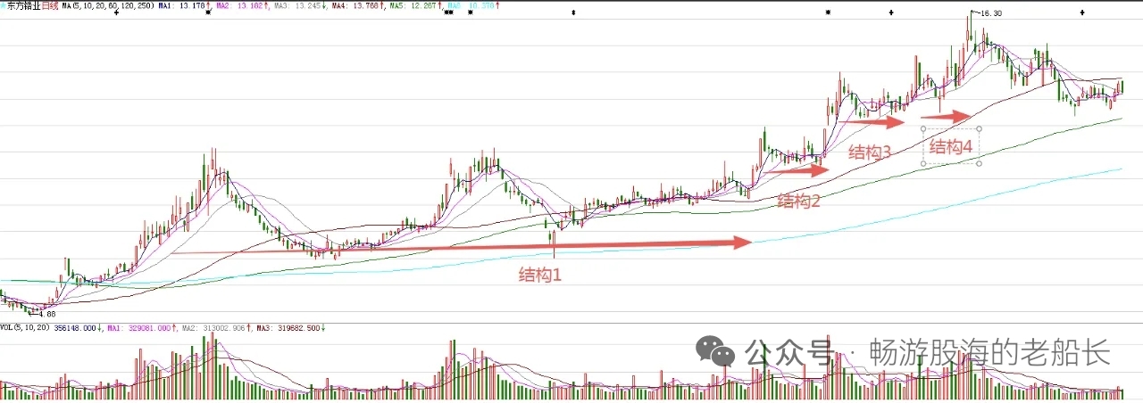 调整,也到了结构3和结构4的下轨,空间到了。图中标注的大型结构1突破,意味着股价处在比较大的上涨趋势。结构2是结构1突破后的回踩,意味着后期有波段上涨。结构3和结构4突破,意味着波段上涨不远了。近期构筑的阶段性底部形态已经突破,所以,波段上涨近在咫尺。