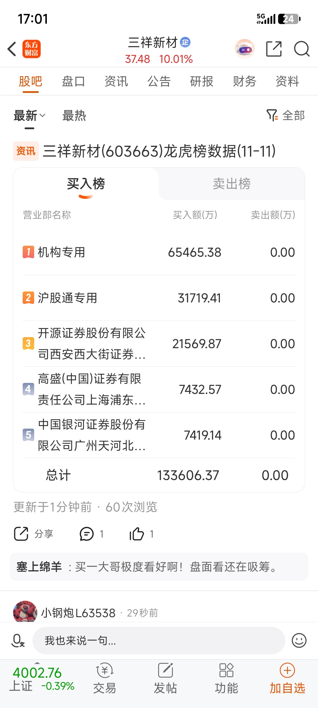 机构这么看好三祥新材吗?六个亿吸筹。为啥不买东方锆业,还有矿源。