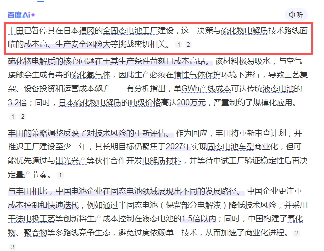 丰田暂停日本福冈全固态电池工厂建设因硫化物电解质技术路线面临的成本高、生产安全风