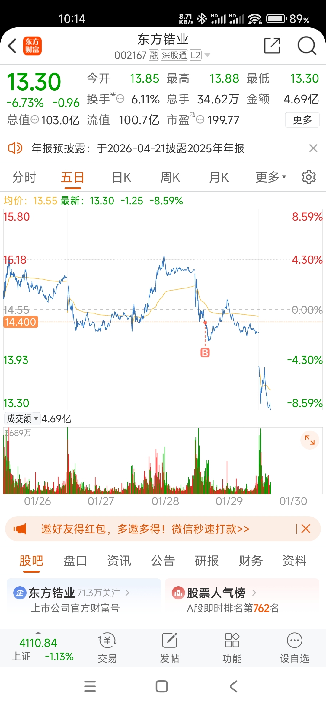 $东方锆业(SZ002167)$ 真是韭菜命昨天买进今天就大跌
