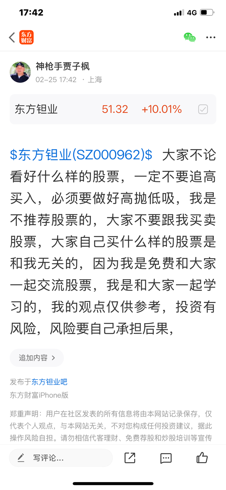 $东方锆业(SZ002167)$ 这个股是我二月二十五号发表文章看好的股票,我是不推荐股票的,大家不要跟我买卖股票,大家自己买什么样的股票是和我无关的,因为我是免费和大家一起交流股票,我是和大家一起学习的,我的观点仅供参考,投资有风险,风险要自己承担后果,
