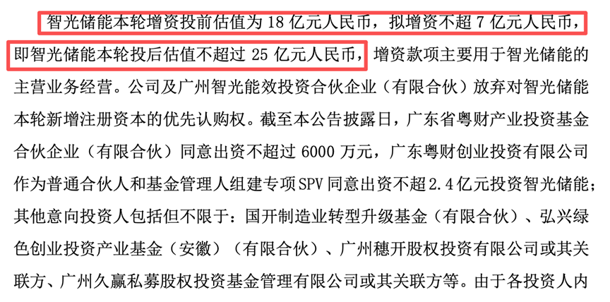 据了解,智光储能为智光电气2018年2月2日以出资1亿元设立的储能全资子公司。此后,智光储能历经3轮融资,最新一轮在2023年12月披露,智光储能彼时增资投前估值为18亿元,拟增资不超7亿元,即智光储能本轮投后估值不超过25亿元。