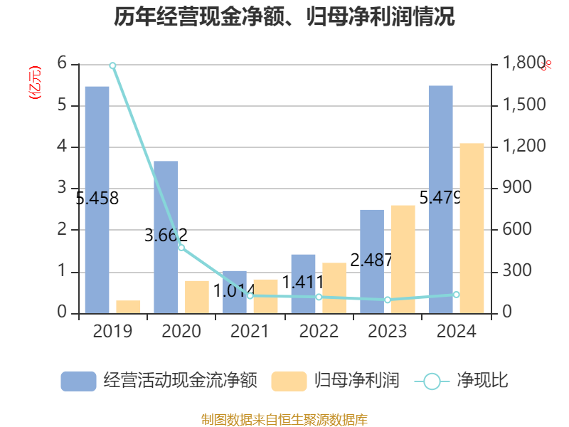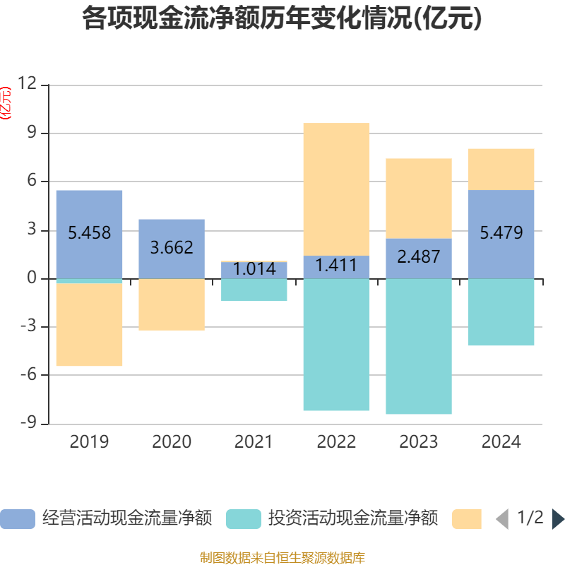 截至2024年,公司经营活动现金流净额为5.48亿元,同比增长120.31%;筹资活动现金流净额2.56亿元,同比减少2.39亿元;投资活动现金流净额-4.15亿元,上年同期为-8.41亿元。