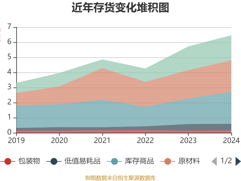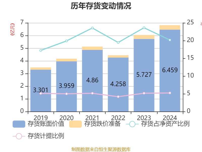 从存货变动来看,截至2024年末,公司存货账面价值为6.46亿元,占净资产的20.15%,较上年末增加7323.68万元。其中,存货跌价准备为3554.08万元,计提比例为5.22%。