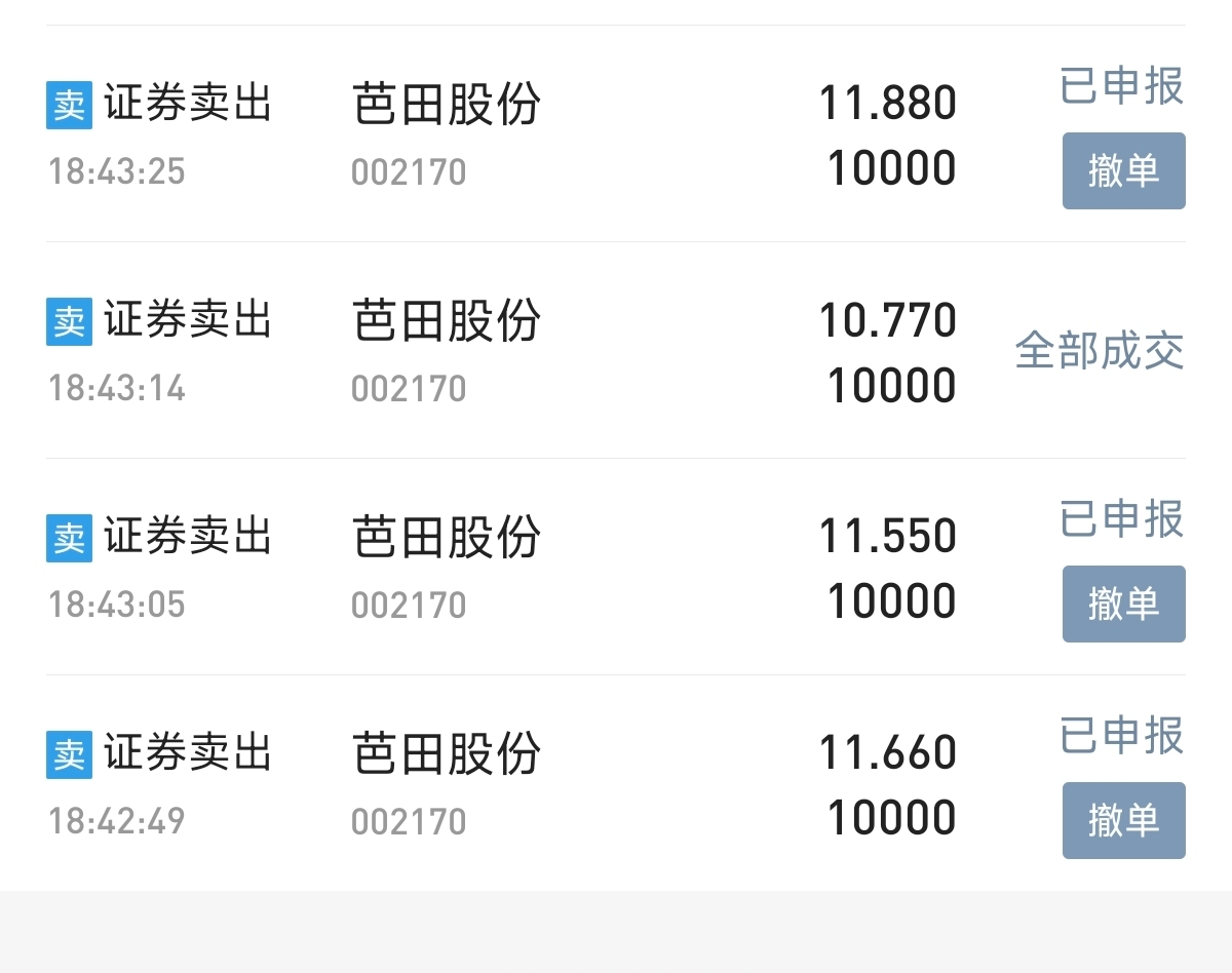 $芭田股份(SZ002170)$ 乌龙指,把11.77挂成了10.77