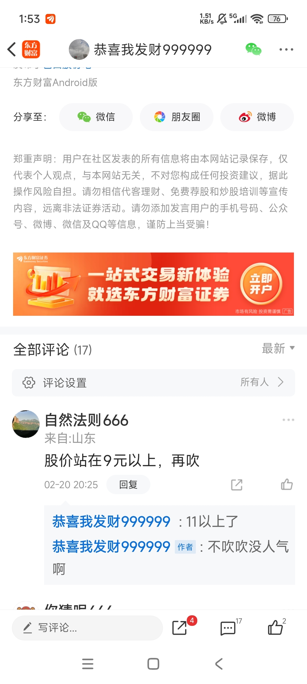 温馨提示: 1.根据《证券法》规定,禁止编造、传播虚假信息或者误导性信息,扰乱证券市场;2.用户在本社区发表的所有资料、言论等仅代表个人观点,与本网站立场无关,不对您构成任何投资建议。用户应基于自己的独立判断,自行决定证券投资并承担相应风险。《东方财富社区管理规定》