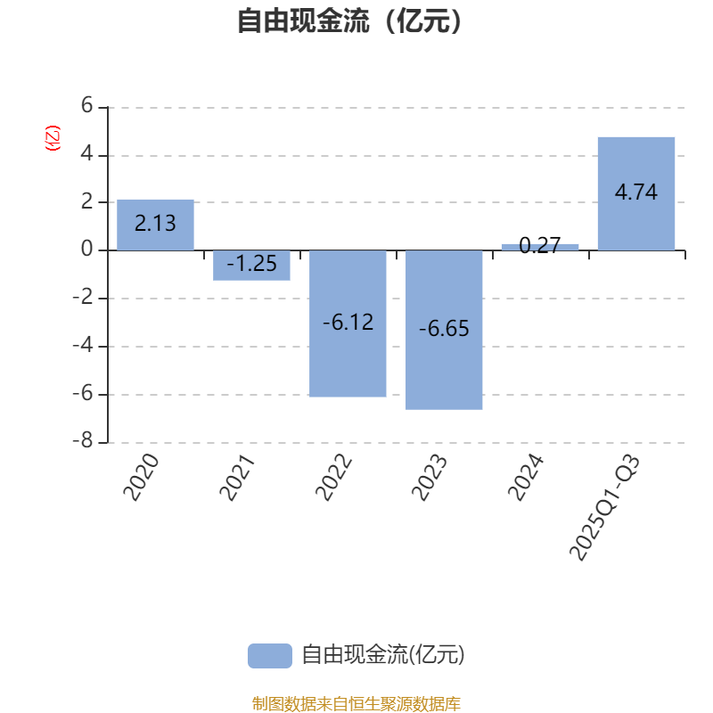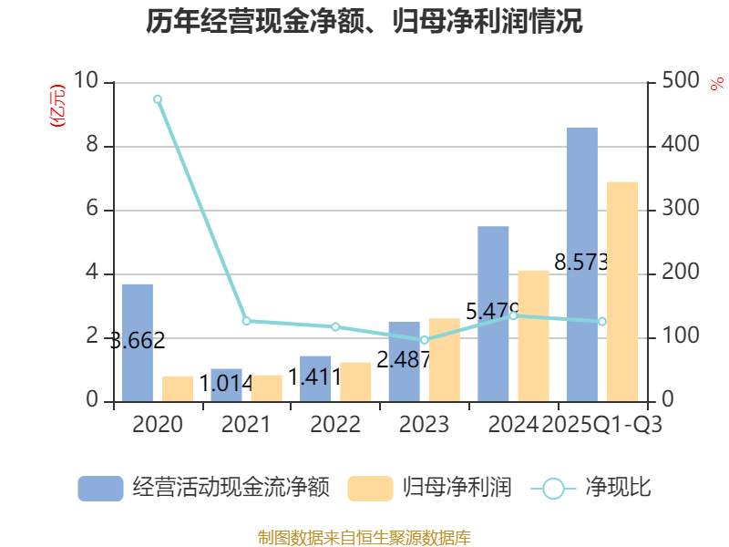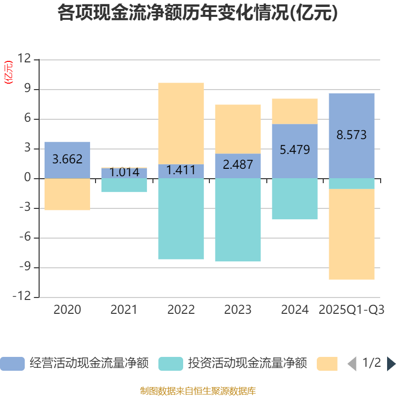 2025年前三季度,公司经营活动现金流净额为8.57亿元,同比增长99.9%;筹资活动现金流净额-9.15亿元,同比减少9.94亿元;投资活动现金流净额-1.09亿元,上年同期为-3.82亿元。