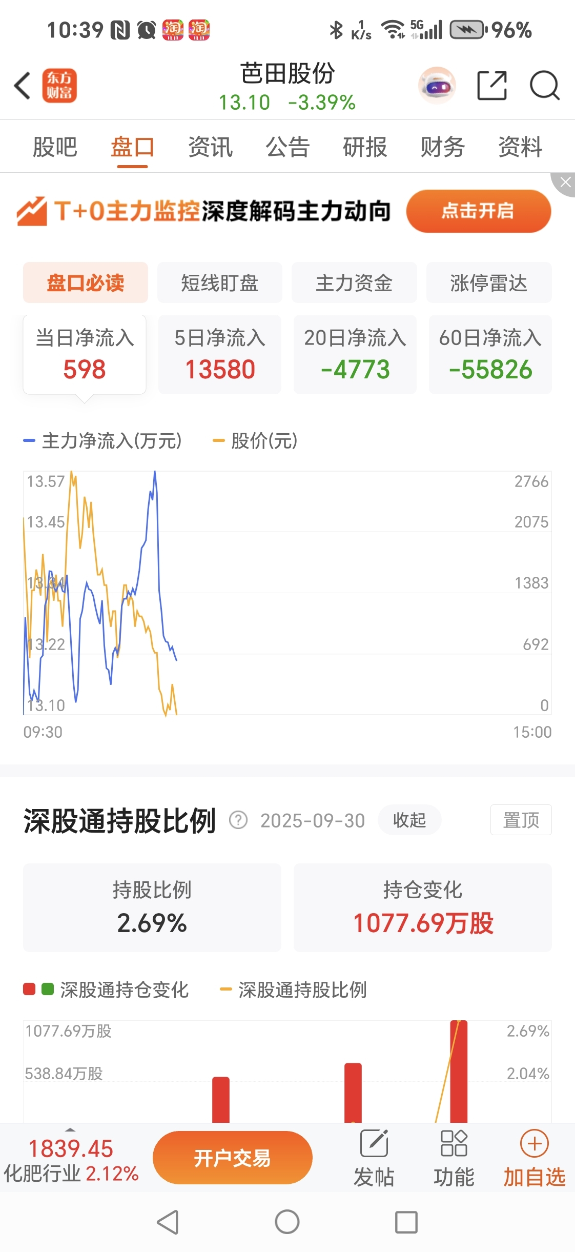 $芭田股份(SZ002170)$ 今天这股套人了,主力资金趋势图线看,主力还没停止流出,还没企稳,13.10以为是今天低点,看来补仓还是补早了