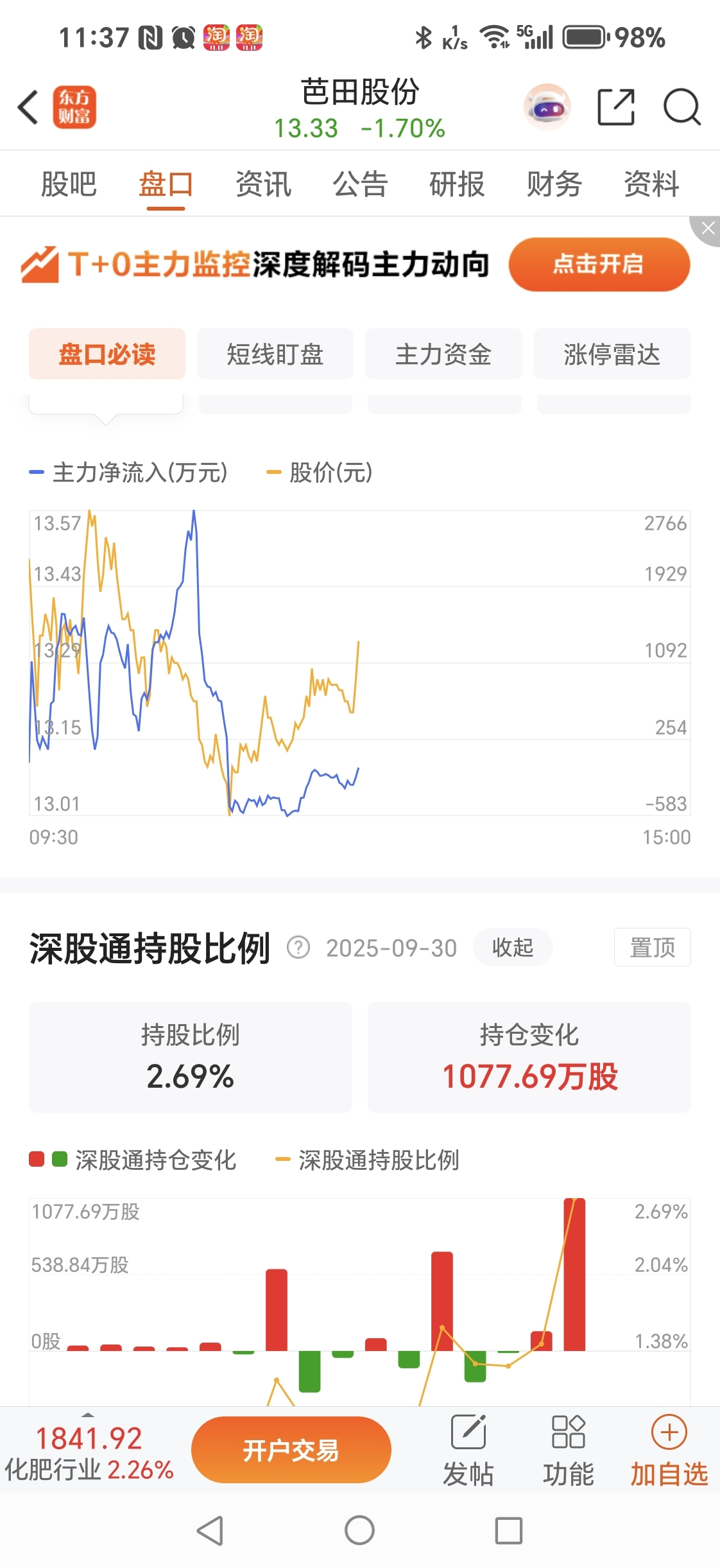 $芭田股份(SZ002170)$ 别跑了,主力开始干活了