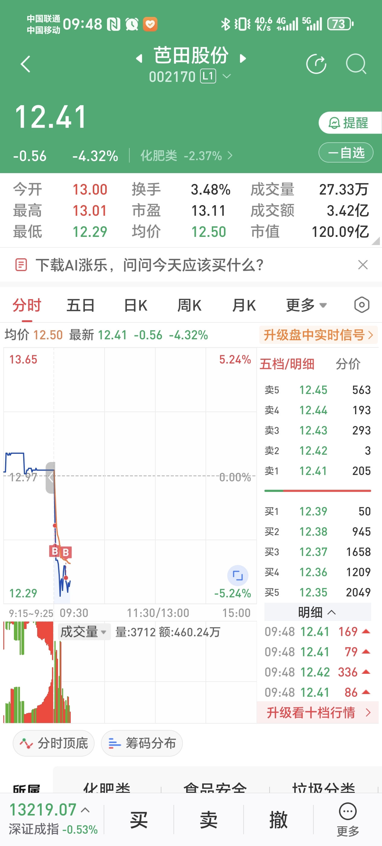$芭田股份(SZ002170)$ 已经加了两笔了,不能再加了,跌停梭哈