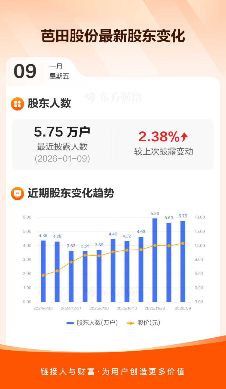 芭田股份:截至1月9日最新股东户数5.75万户,较上期增加2.38%