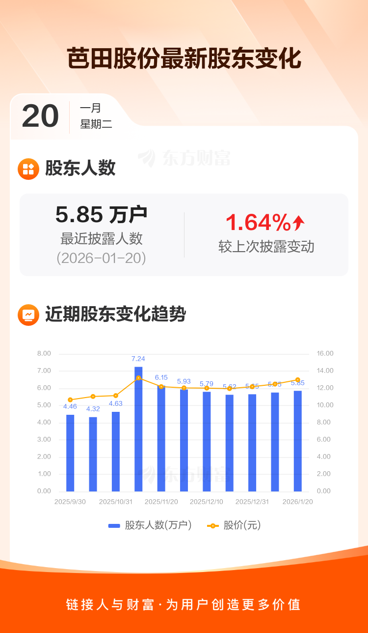 芭田股份:截至1月20日最新股东户数5.85万户,较上期增加1.64%