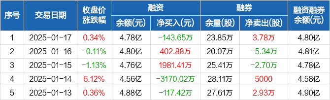 楚江新材:融资净偿还143.65万元,融资余额4.78亿元(01-17)