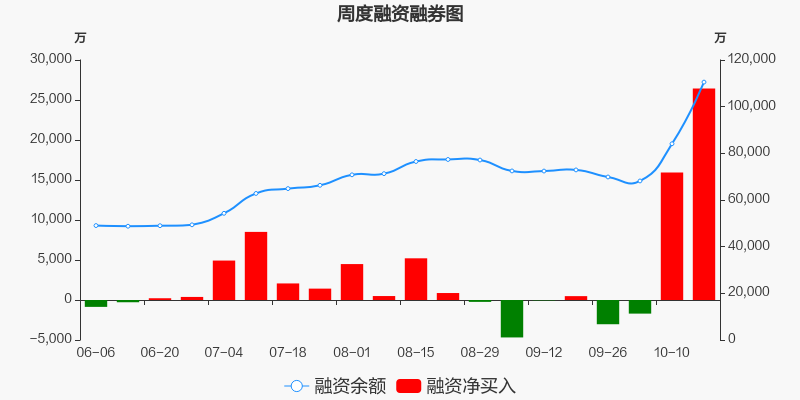 楚江新材本周(2025/10/13-2025/10/17)累计涨幅达19.1%,截至10月17日最新股价报收11.91元。从增量上来看,10月13日至10月16日融资买入交易规模11.57亿元,融资偿还规模8.92亿元,期内融资净买入2.64亿元。从存量上来看,截止10月19日,楚江新材融资融券余额11.1亿元,其中融资余额规模11.05亿元,融券余额规模455.25万元。