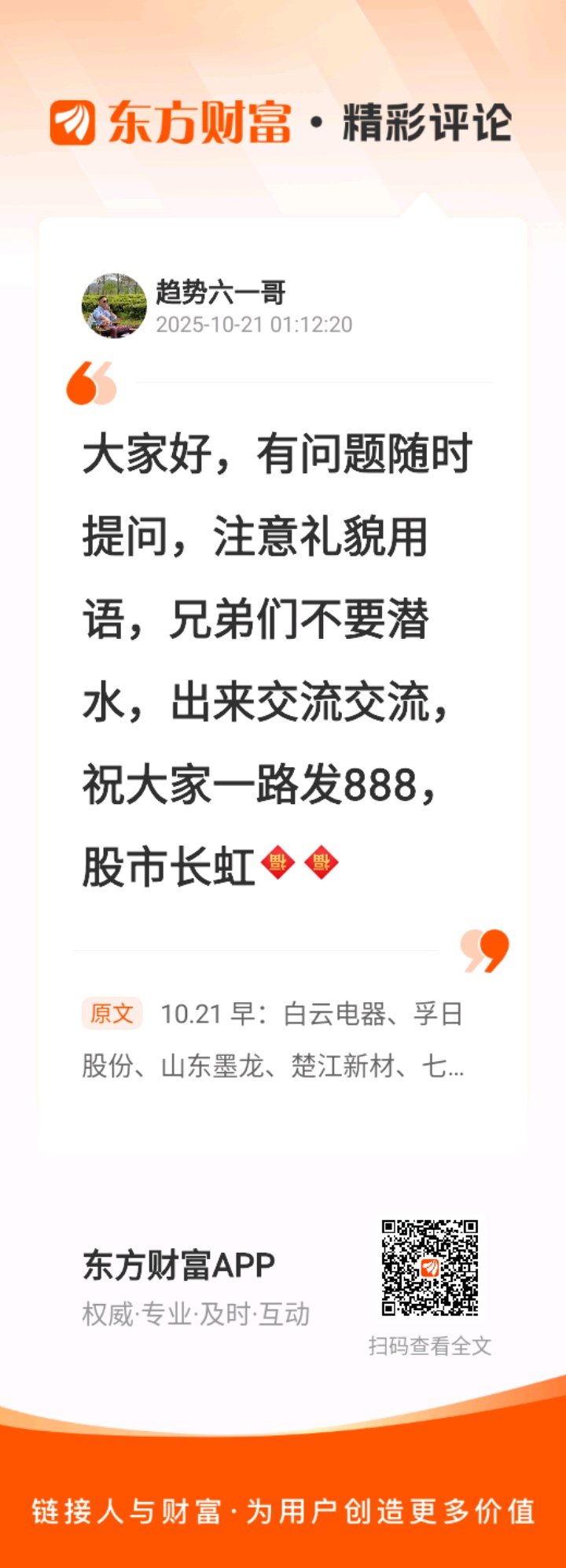 $楚江新材(SZ002171)$$山东墨龙(SZ002490)$$国新能源(SH600617)$有点东西,跟着哥,心里踏实多了。佩服//@趋势六一哥 :大家好,有问题随时提问,注意礼貌用语,兄弟们不要潜水,出来交流交流,祝大家一路发888,股市长虹