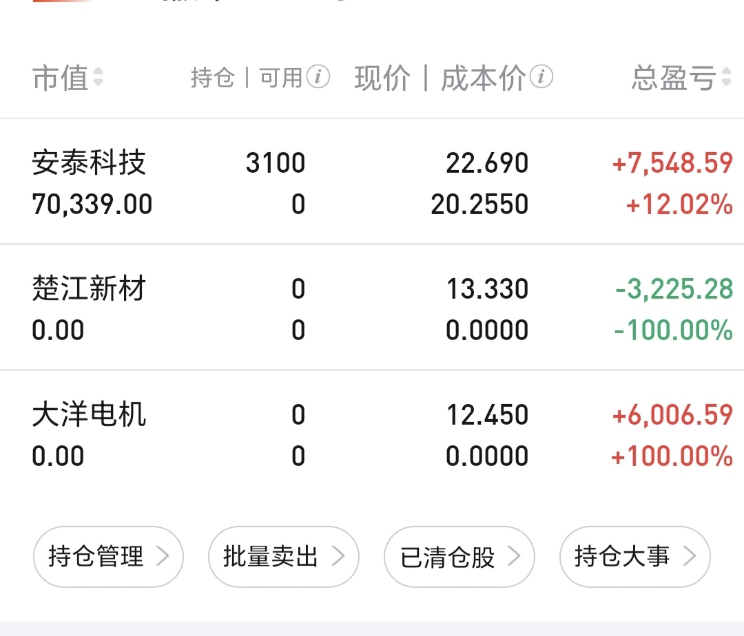 $楚江新材(SZ002171)$ $安泰科技(SZ000969)$ $大洋电机(SZ002249)$ 楚江负三止损了,大洋总是冲高回落,7点卖出,安泰最牛逼,我的认知里面这些天唯一一个没有被打下去的票,今天天际大跌,我反手买了安泰赌对了哈哈