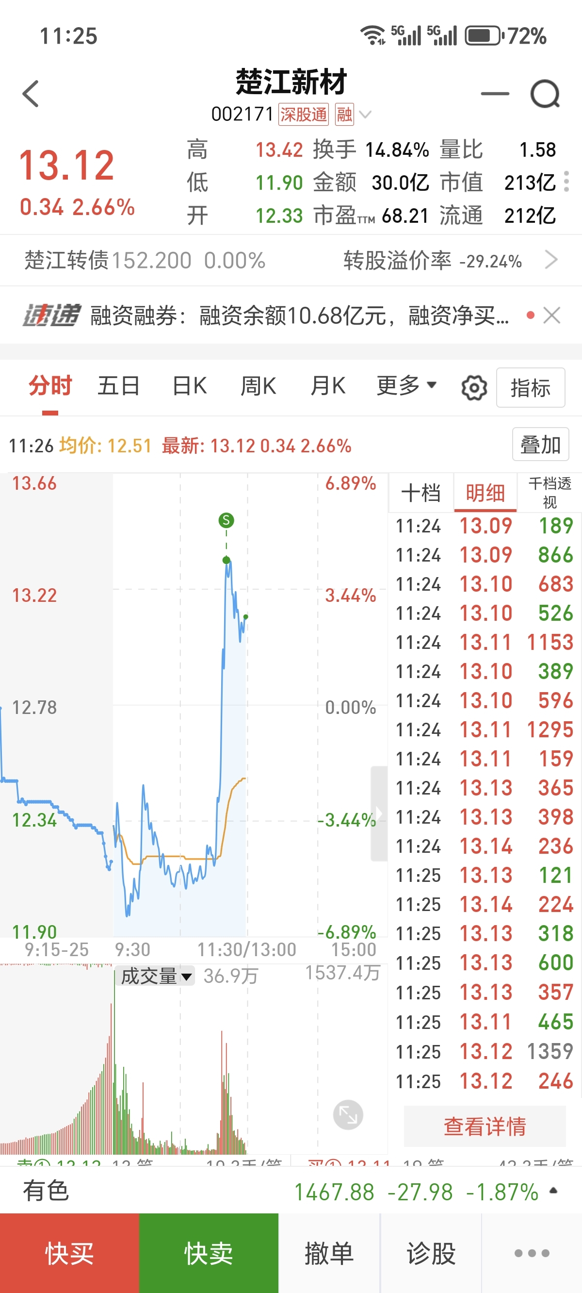 $楚江新材(SZ002171)$ 先撤了,下午再看