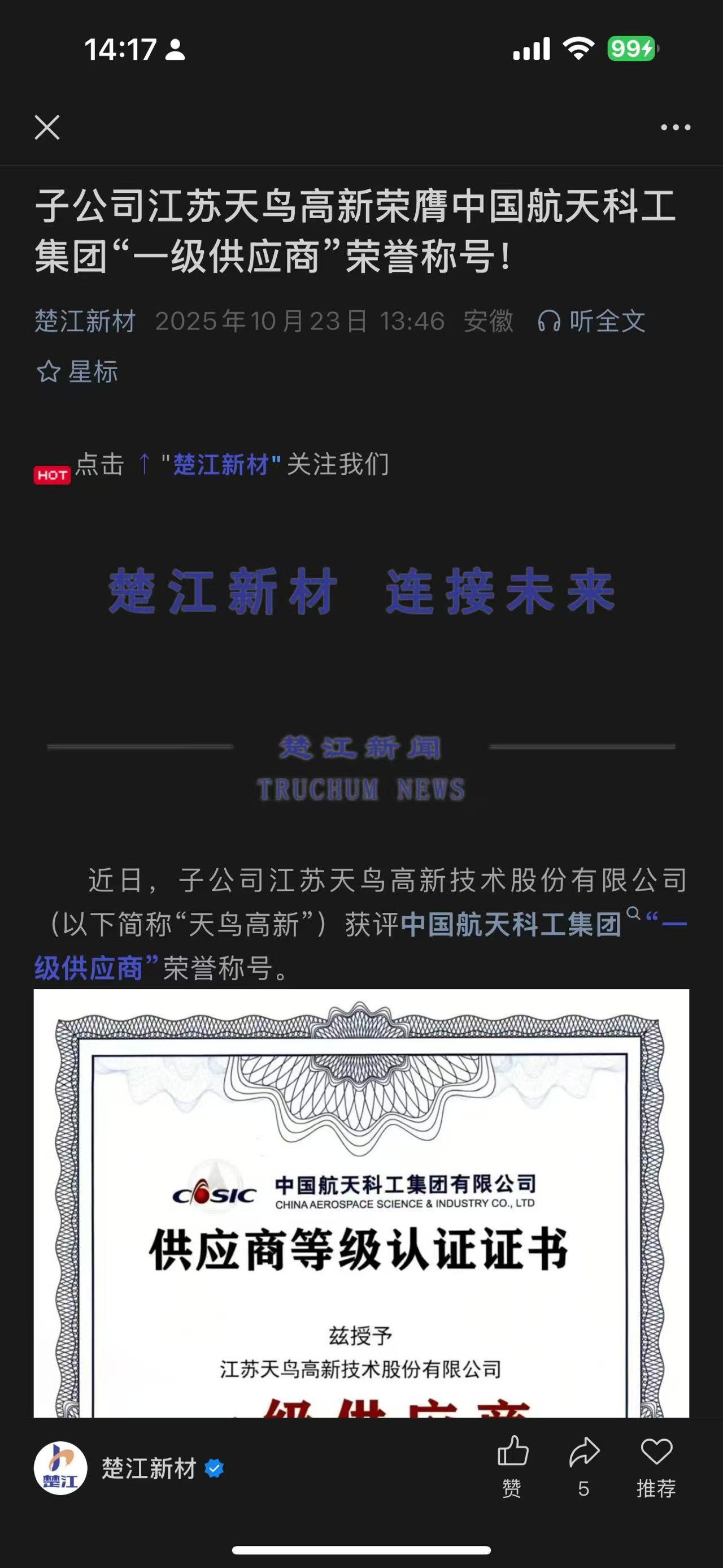 家人们,楚江新材又爆实锤利好!子公司天鸟高新刚拿下国家级硬资质!中国航天科工集团