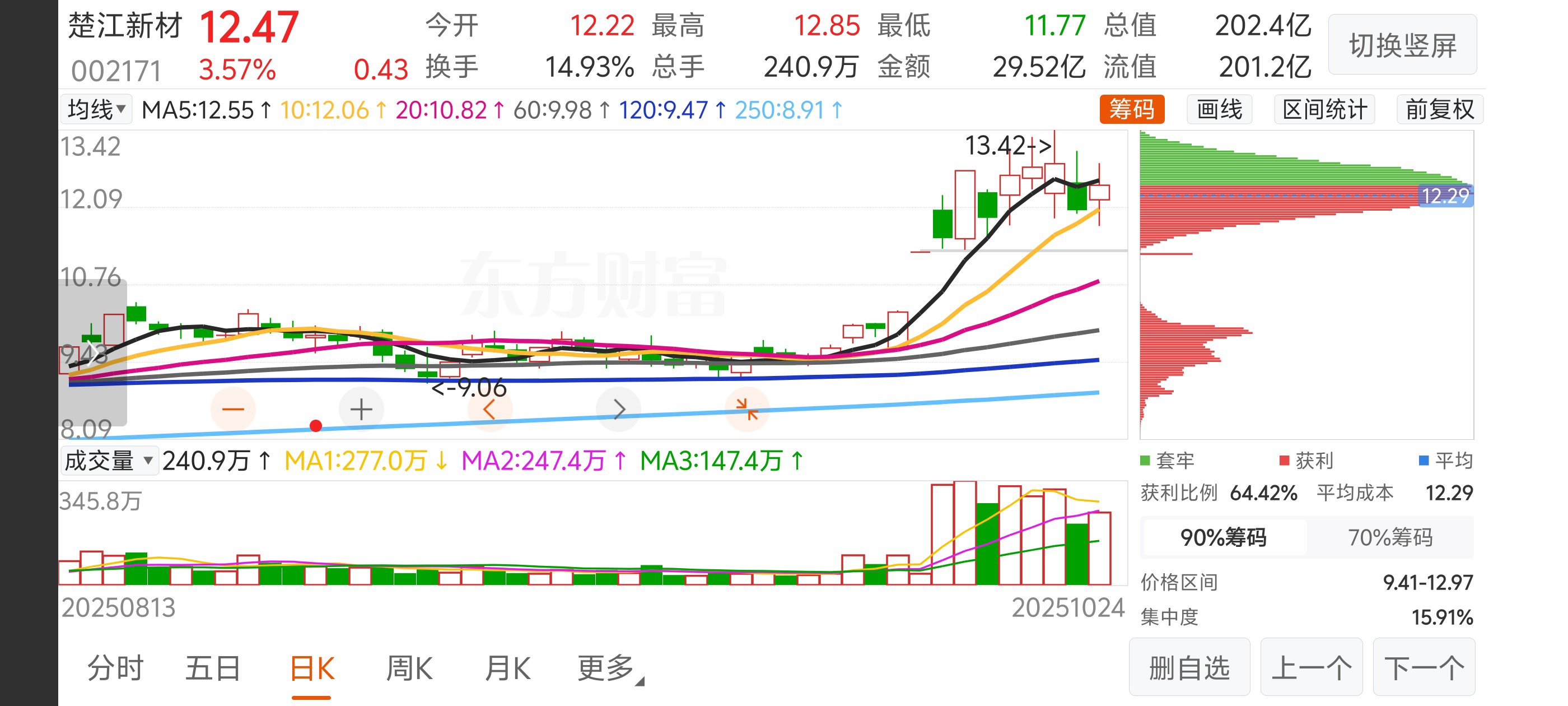 $楚江新材(SZ002171)$ 很多人看到三季报的股东人数增加很多,但从筹码角度看,9月30日之前的筹码不多了(如图),从量能看,一字板后已产生了高量顺移,理应看多做多。另外,股价向上的催化因素不就是业绩向上裂变,基本面紧贴时代而发展么!
