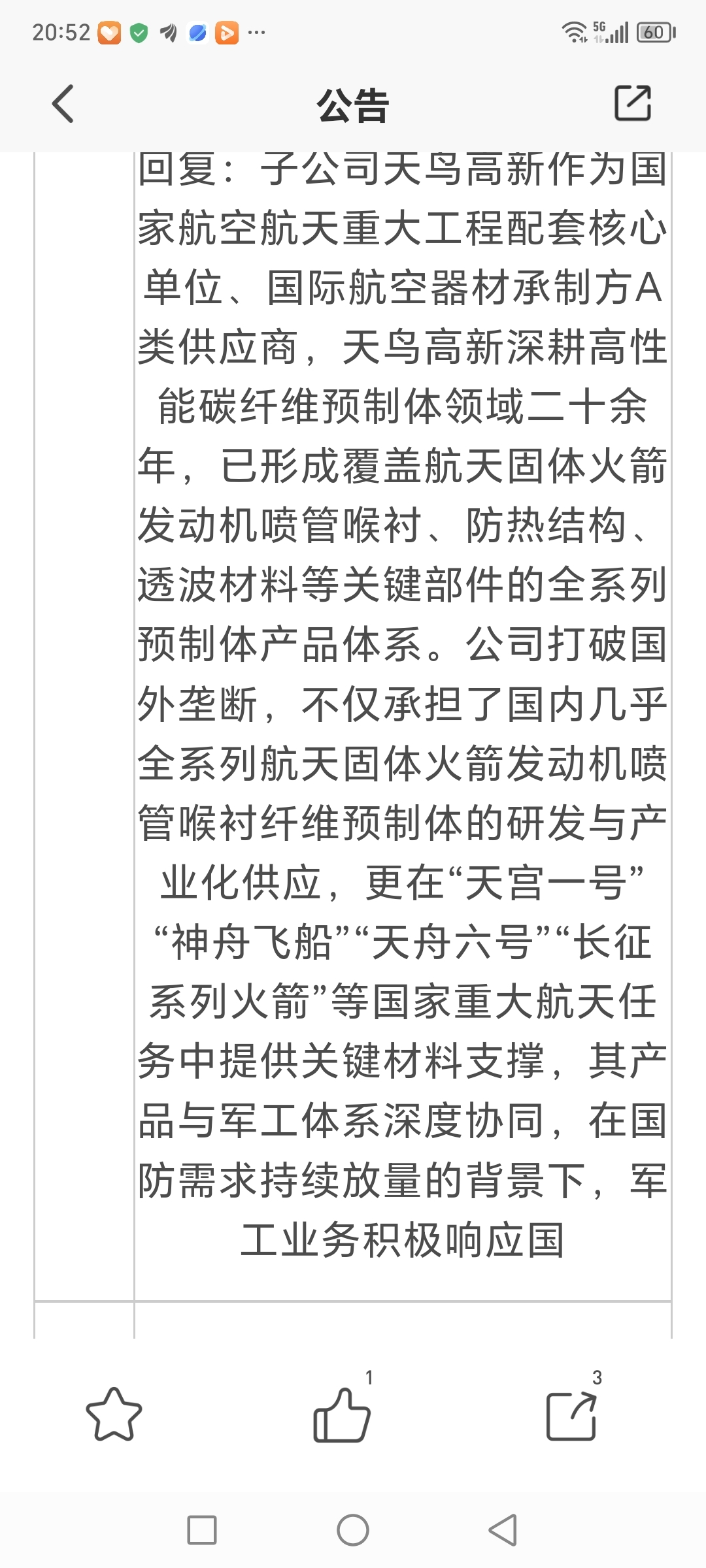 $楚江新材(SZ002171)$ 楚江新材国产替代,子公司产品助力今晚神二十一成功发射!楚江打破外企垄断,承担了国内全系列航天固体火箭发动机喷管喉衬纤维预制体的研发与供应。