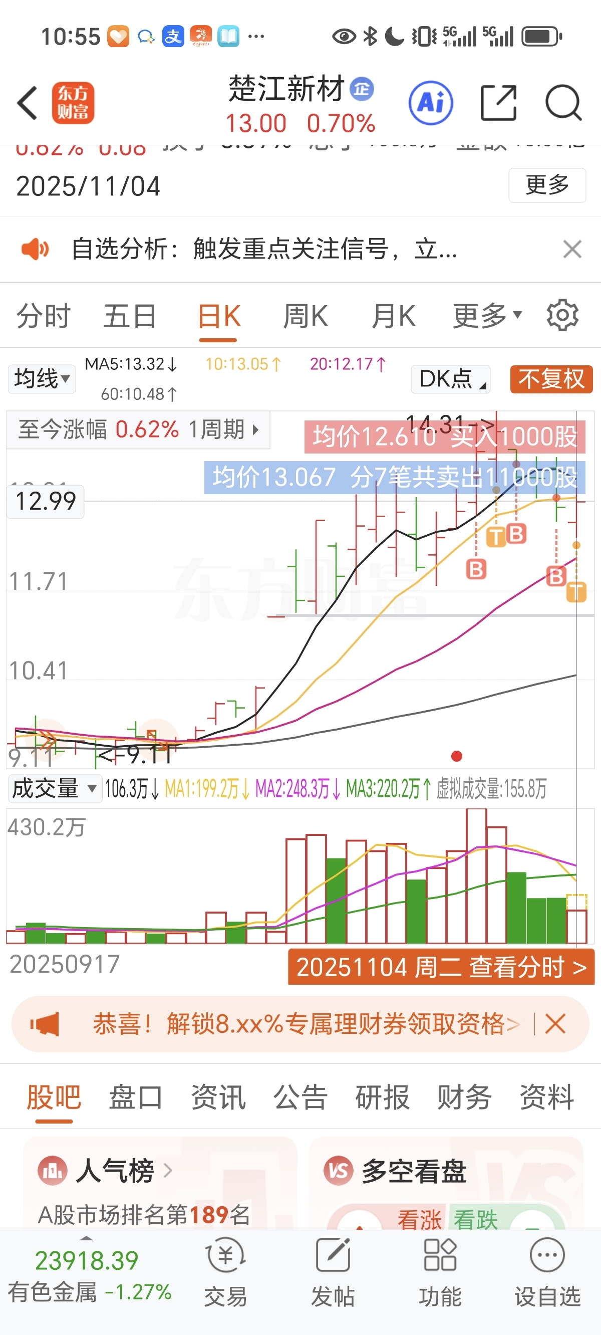13.06抛了大部分,留了1K股T来的。今日成交股票:操作原因: