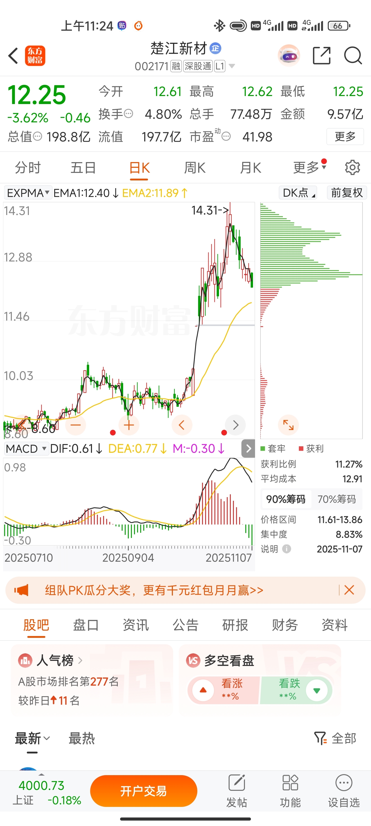 $楚江新材(SZ002171)$ 获利筹码只剩百分之十一