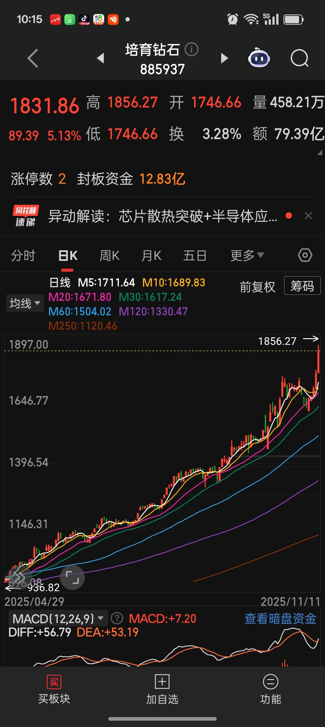 看看培育钻石的日线图,楚江在同花顺里板块排在最相关的板块是培育钻石板块,看看它的