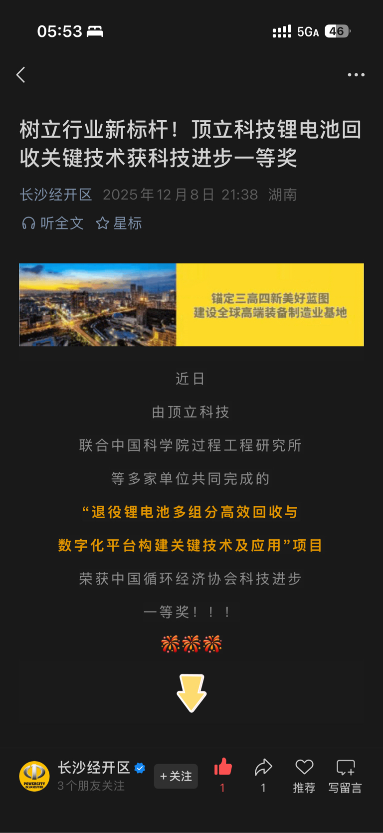 楚江的子公司顶立科技技术挺牛逼,锂电池回收关键技术获科技进步一等奖,可惜楚江股价