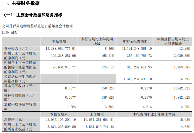 此前于2025年10月24日,楚江新材(002171)公布2025年三季报,公司前三季营业收入为441.9亿元,同比上升13.29%;归母净利润为3.55亿元,同比上升2089.49%;扣非归母净利润自上年同期亏损1745万元成功扭亏,实现扣非归母净利润3.25亿元。其中第三季度,公司营业收入为153.9亿元,同比上升8.46%;归母净利润自去年同期亏损1.52亿元成功扭亏,实现归母净利润1.04亿元;扣非归母净利润自去年同期亏损1.31亿元成功扭亏,实现扣非归母净利润9860万元。